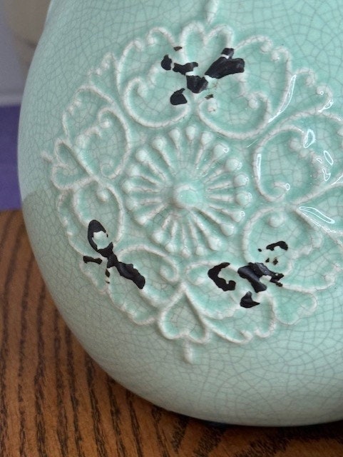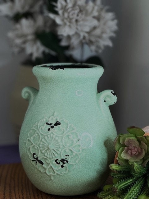 Whether you are a collector of vintage items or simply appreciate the beauty of unique decor, this vase is a must-have. Its intricate floral design and striking turquoise hue make it a standout piece that will surely catch the eye of anyone who enters your home. It is the perfect addition to your collection or a thoughtful gift for that special someone who appreciates vintage treasures.