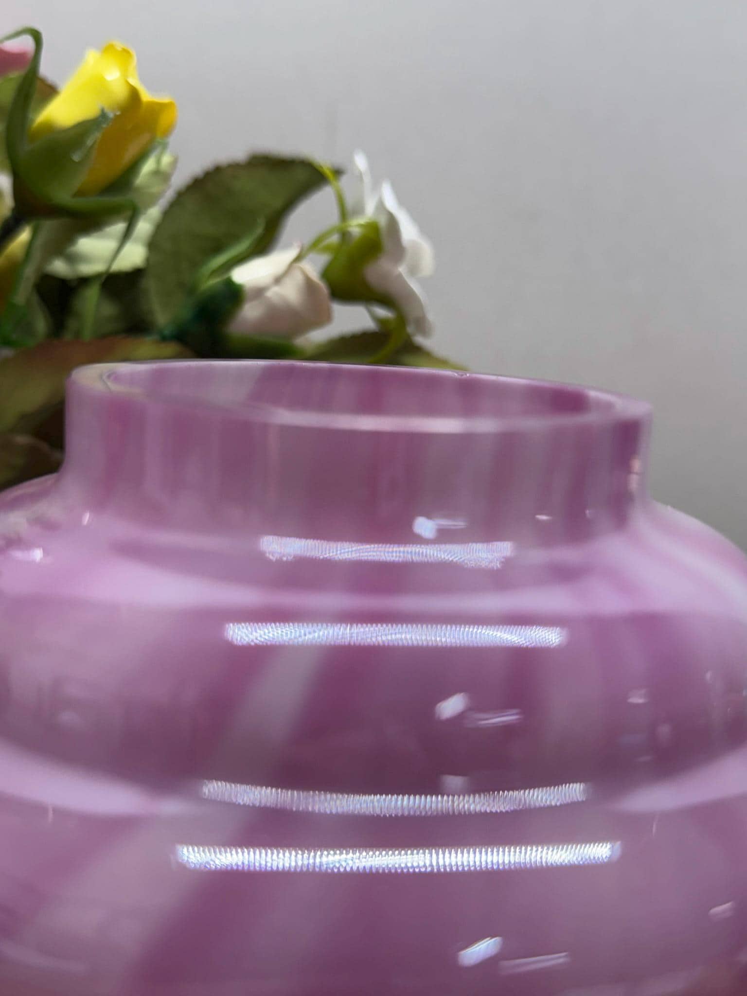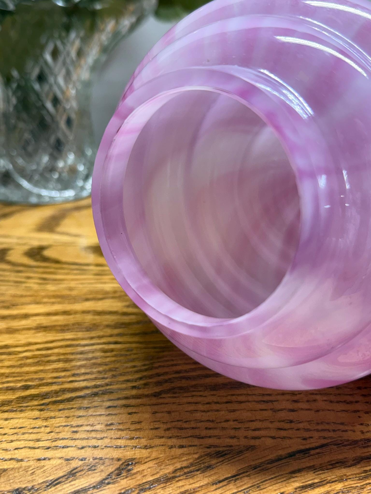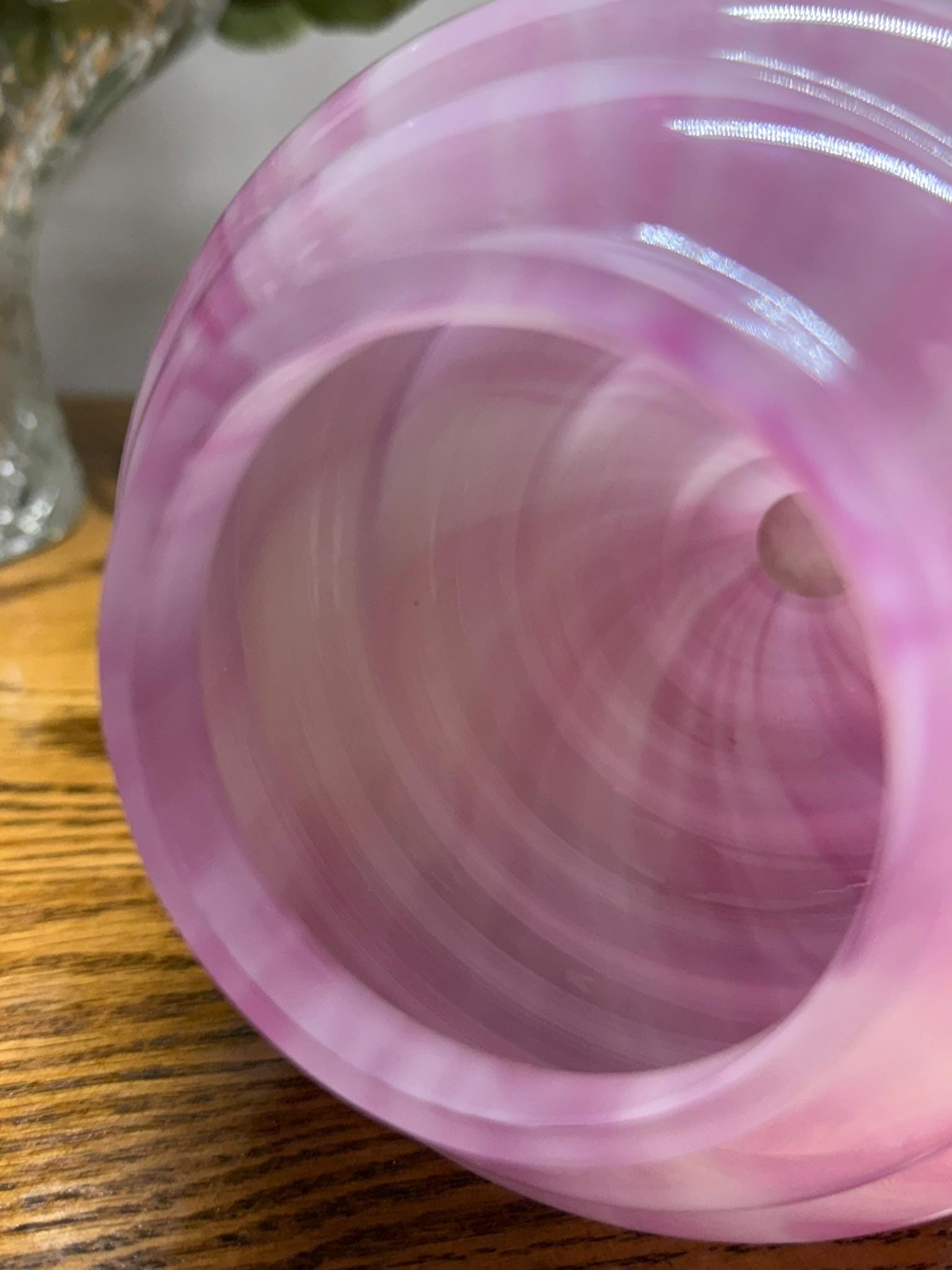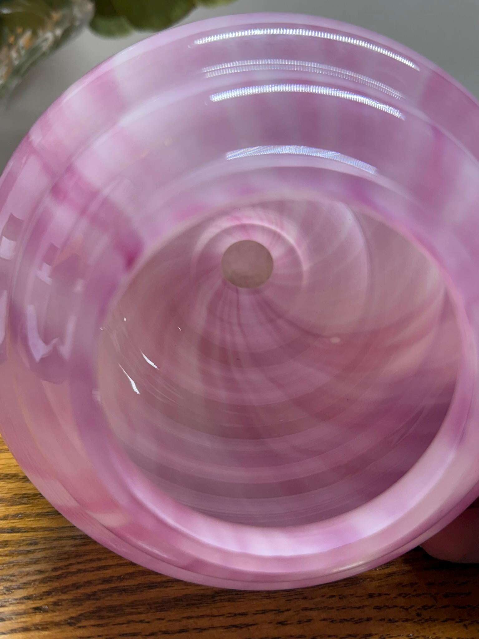 Although this beautiful item lacks a maker's mark, its design is reminiscent of the Frank Welz Glassworks, and the color closely resembles their Vertical Stripes pattern.
