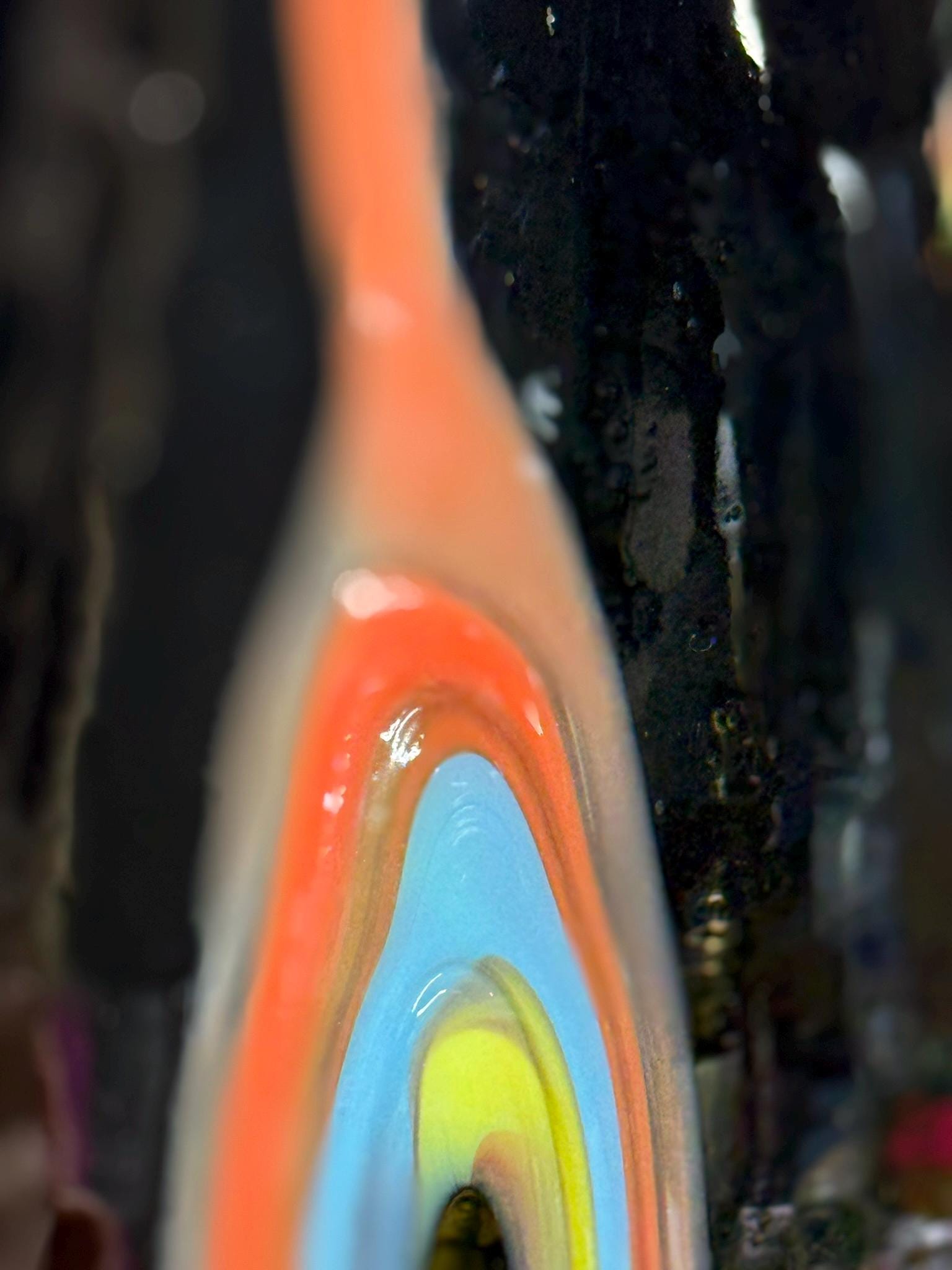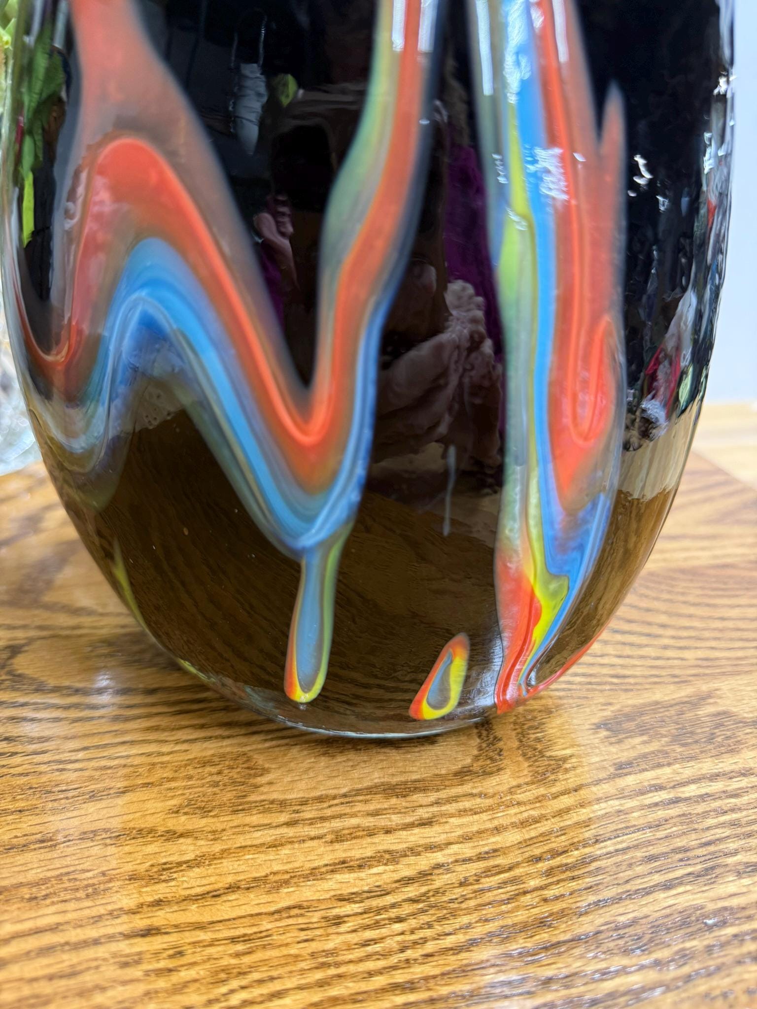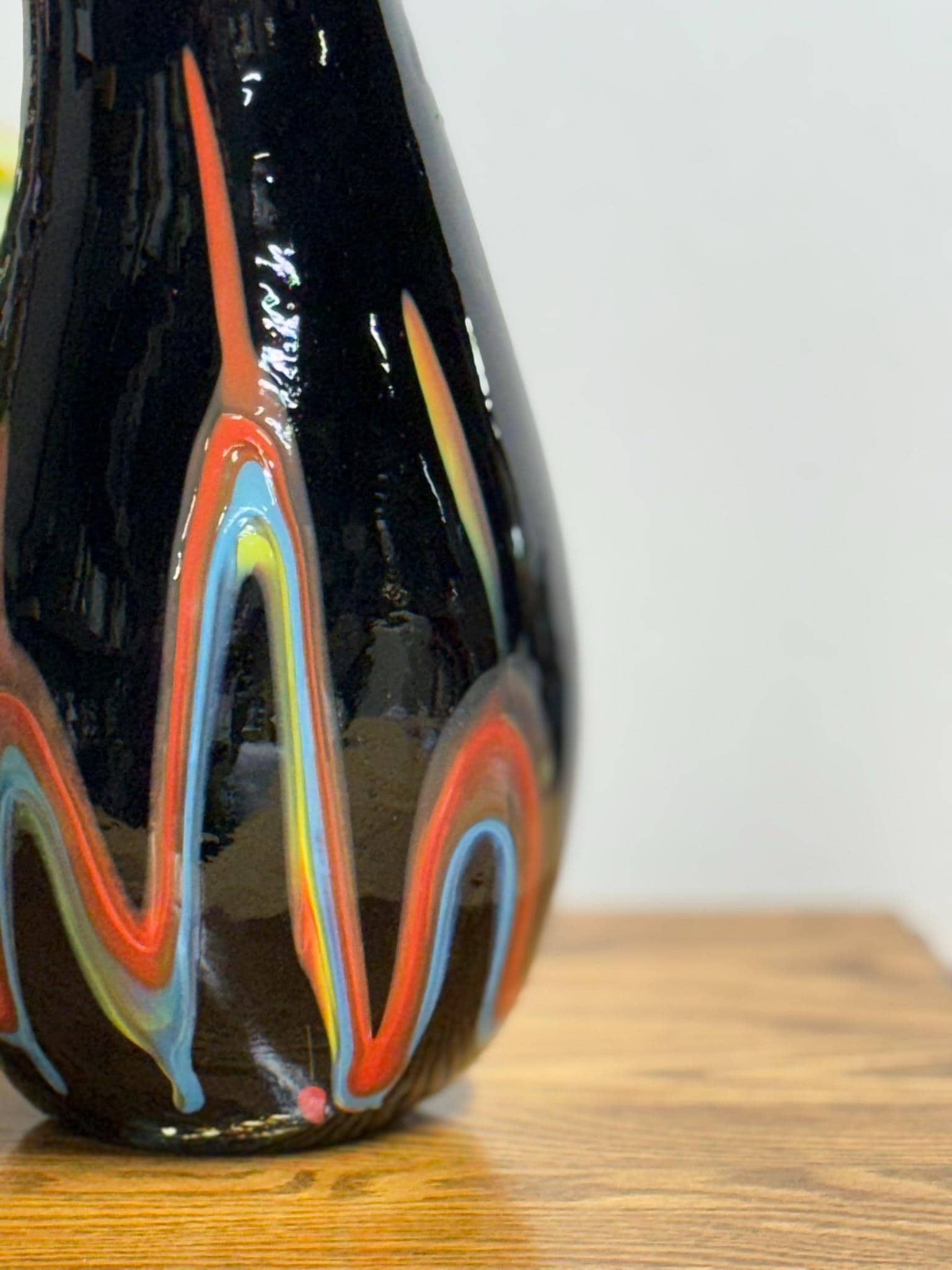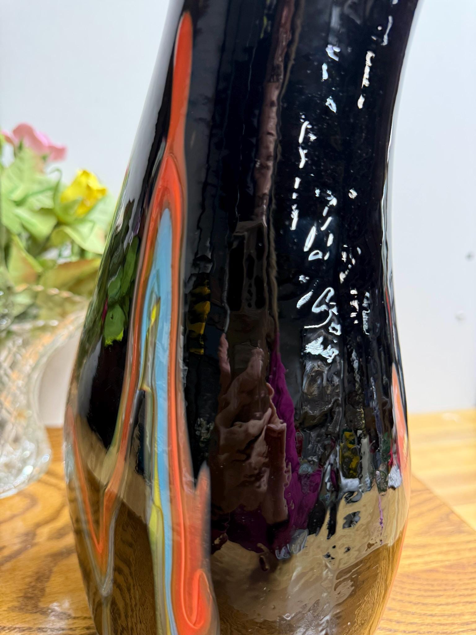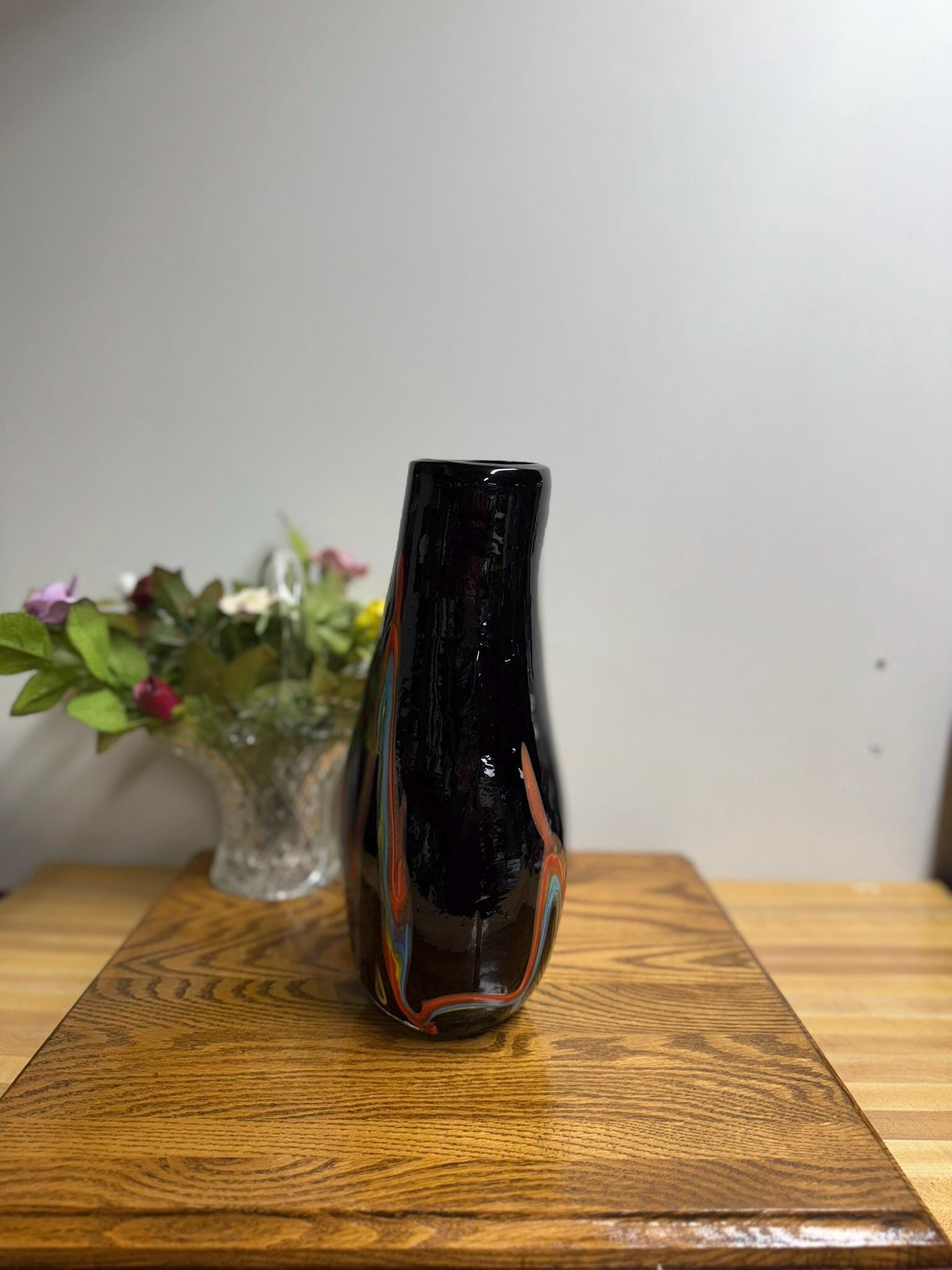 This exquisite hand-blown artisan vase features an opaque black finish paired with a breathtaking pulled flame design that captivates from every angle. While it lacks a signature, the superior craftsmanship and clear commitment to quality suggest a Murano style, occasionally linked to Azerbaijan, indicating that this piece was crafted by a highly skilled artisan.