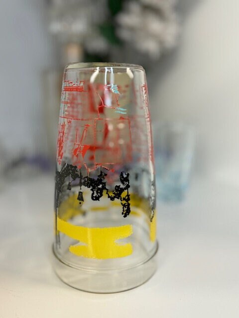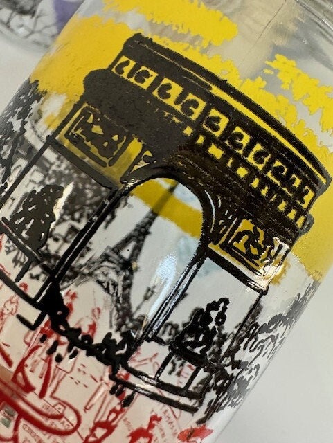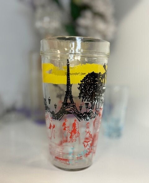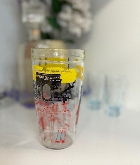 Measuring 7 inches tall, 4 inches wide at the top, and 2.5 inches wide at the base, this MCM cocktail shaker is the perfect size for mixing up your favorite drinks. Its sleek and compact design adds a touch of Parisian flair to your bar, making it a must-have for any collector.